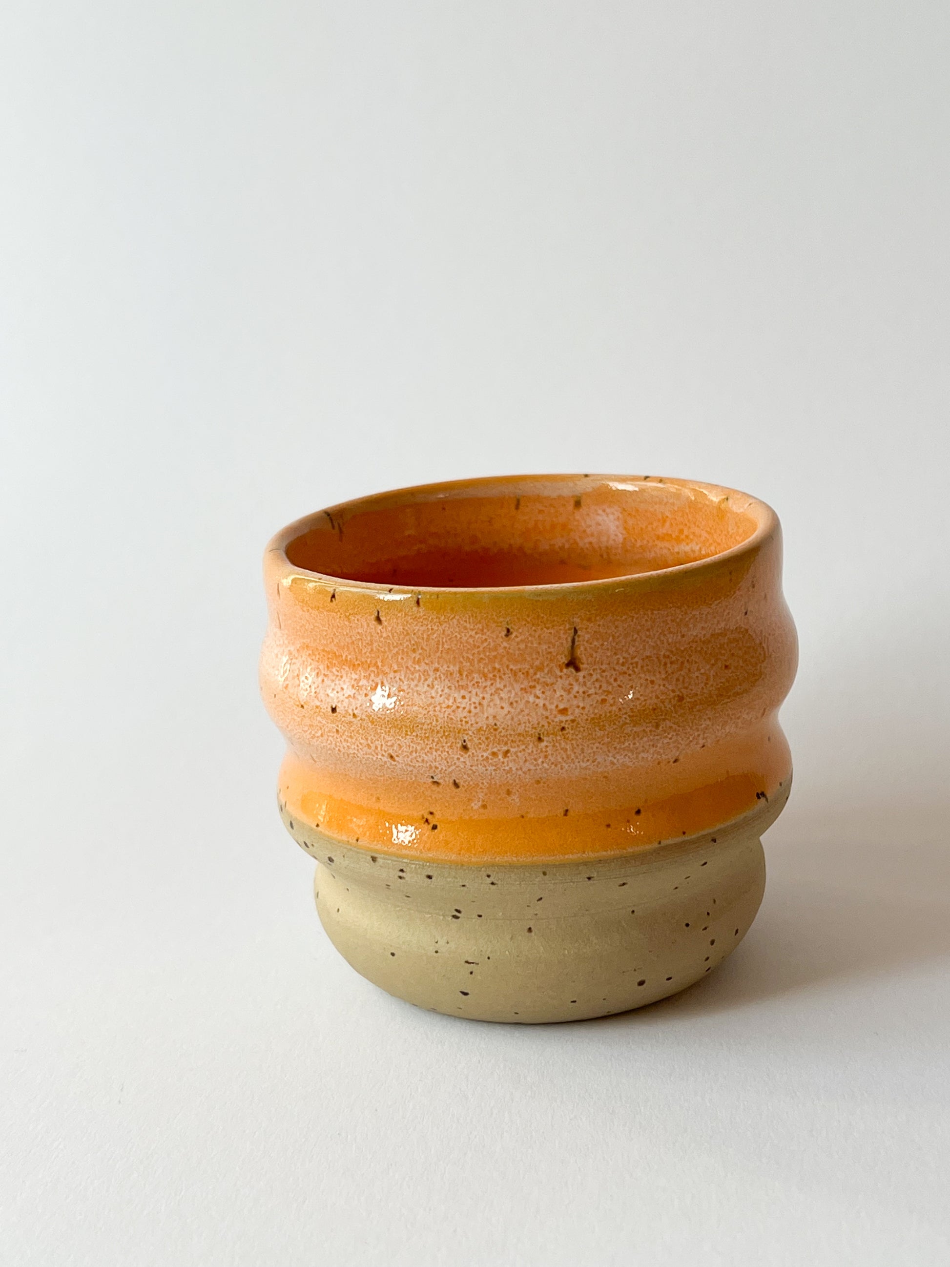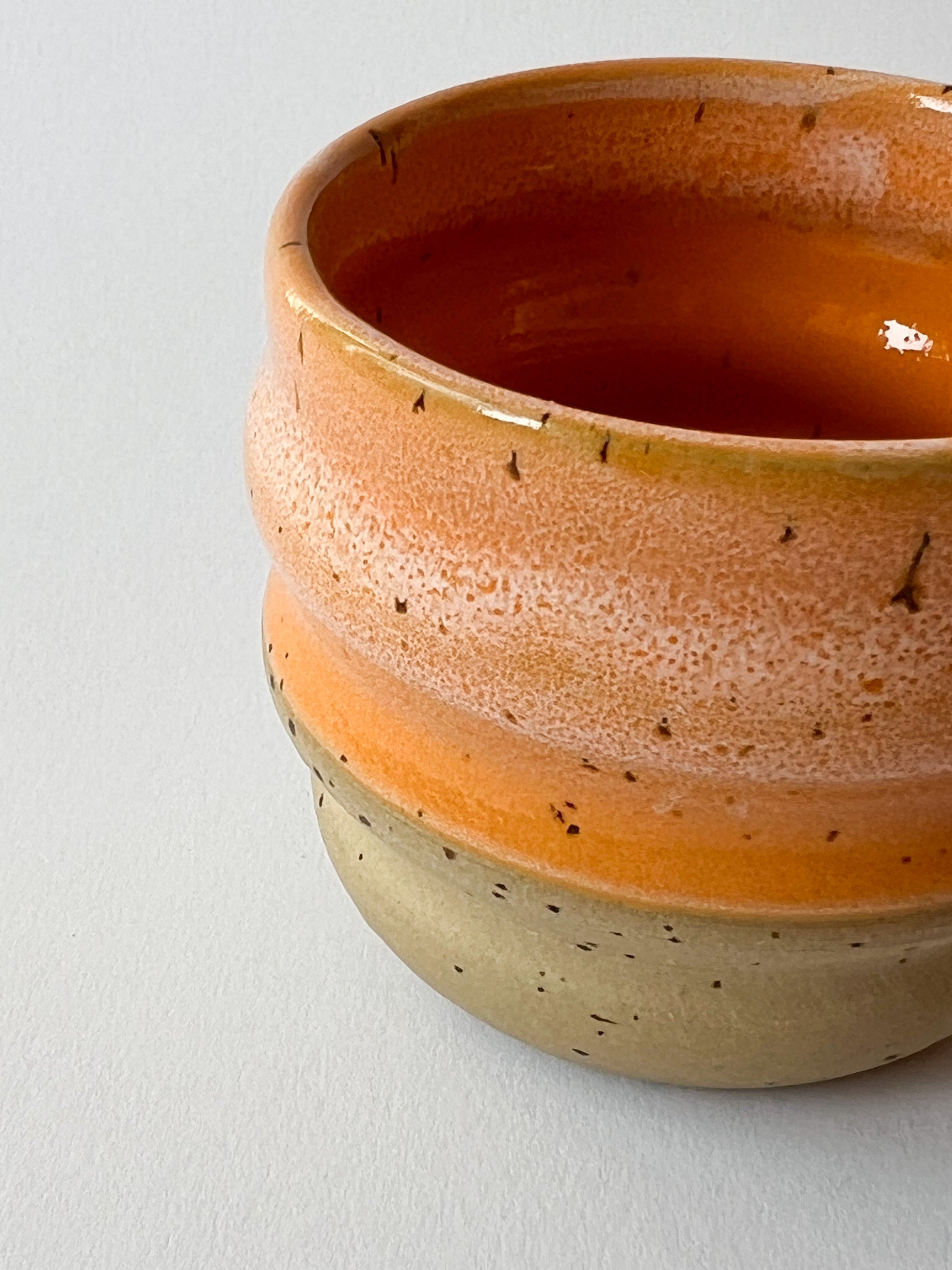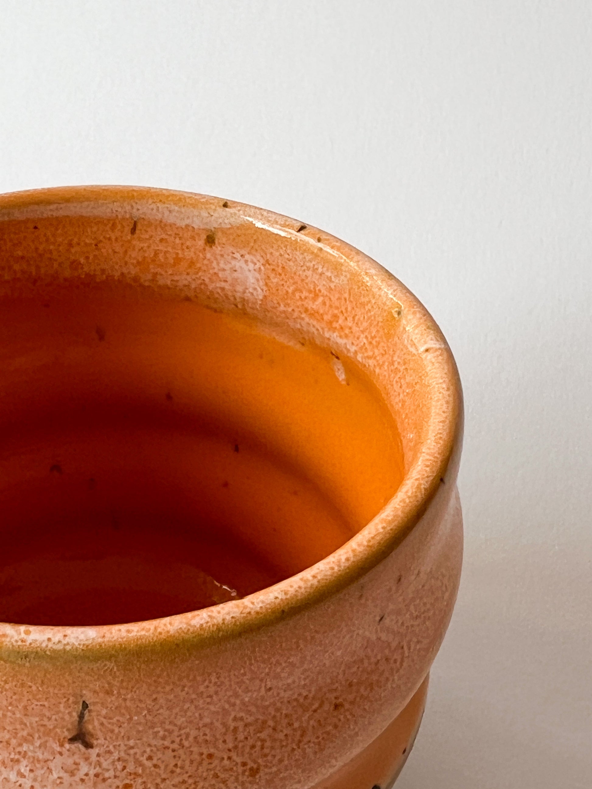 Ein Becher wie ein Sonnenstrahl: Mit seinen warmen Orangetönen, dem naturbelassenen Boden und der weichen Haptik ist dieser handgedrehte Becher der perfekte Begleiter für deine liebsten Milchgetränke – ob Cappuccino, Flat White oder goldene Milch. Die leicht gerillte Form liegt angenehm in der Hand und macht jedes Schlürfen zu einem kleinen Wohlfühlmoment.