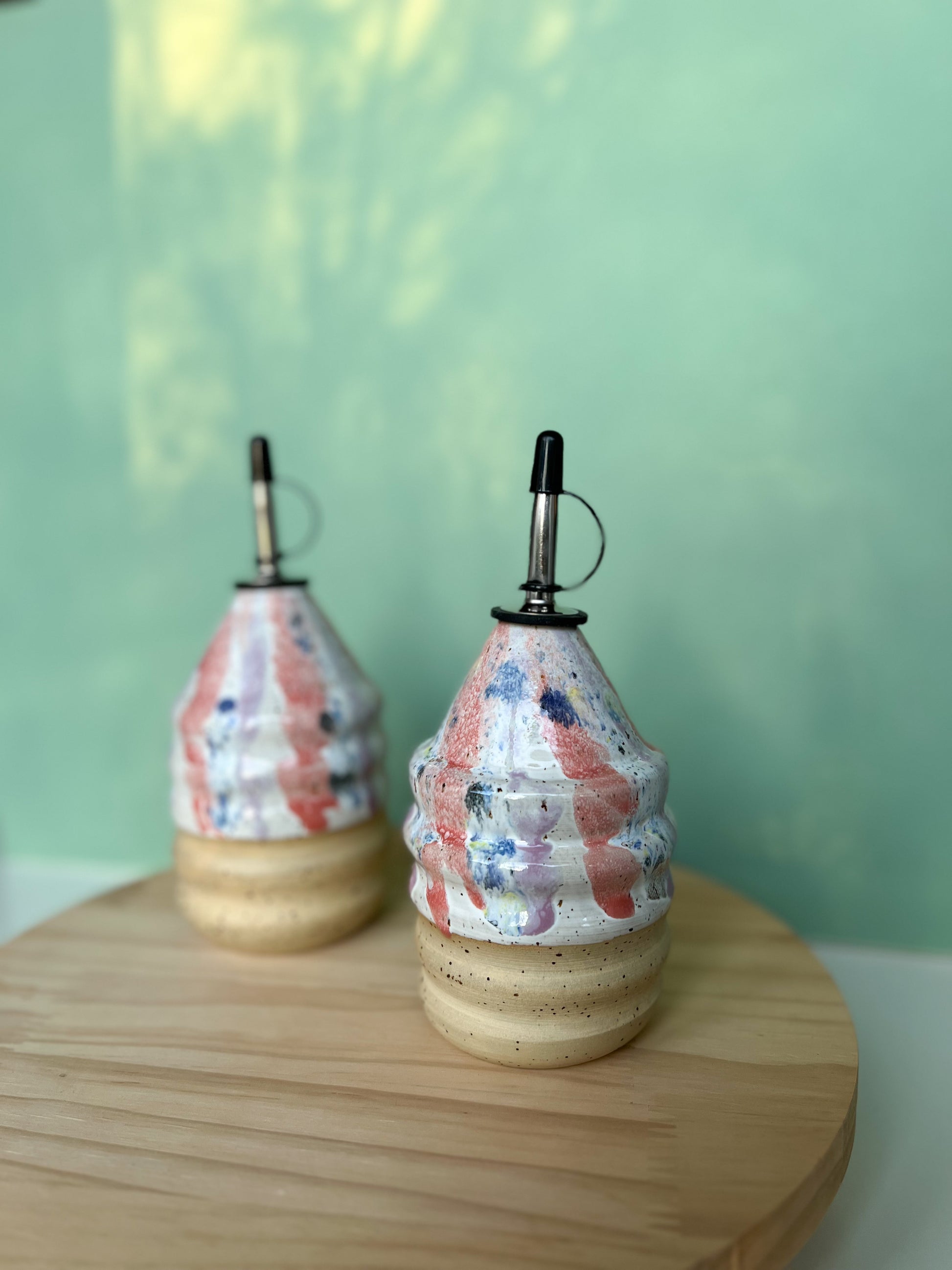 Diese handgedrehte Essig-/Ölflasche vereint funktionales Design mit natürlicher Schönheit. Die organische Form liegt angenehm in der Hand, während die Kombination aus fließenden Blau- und Türkistönen und der matten, naturbelassenen Basis einen ruhigen, frischen und zugleich erdenden Look erzeugt.