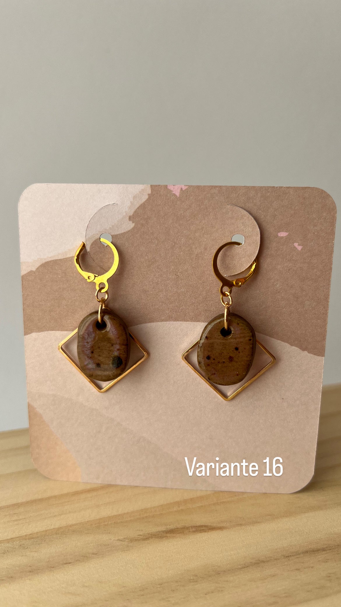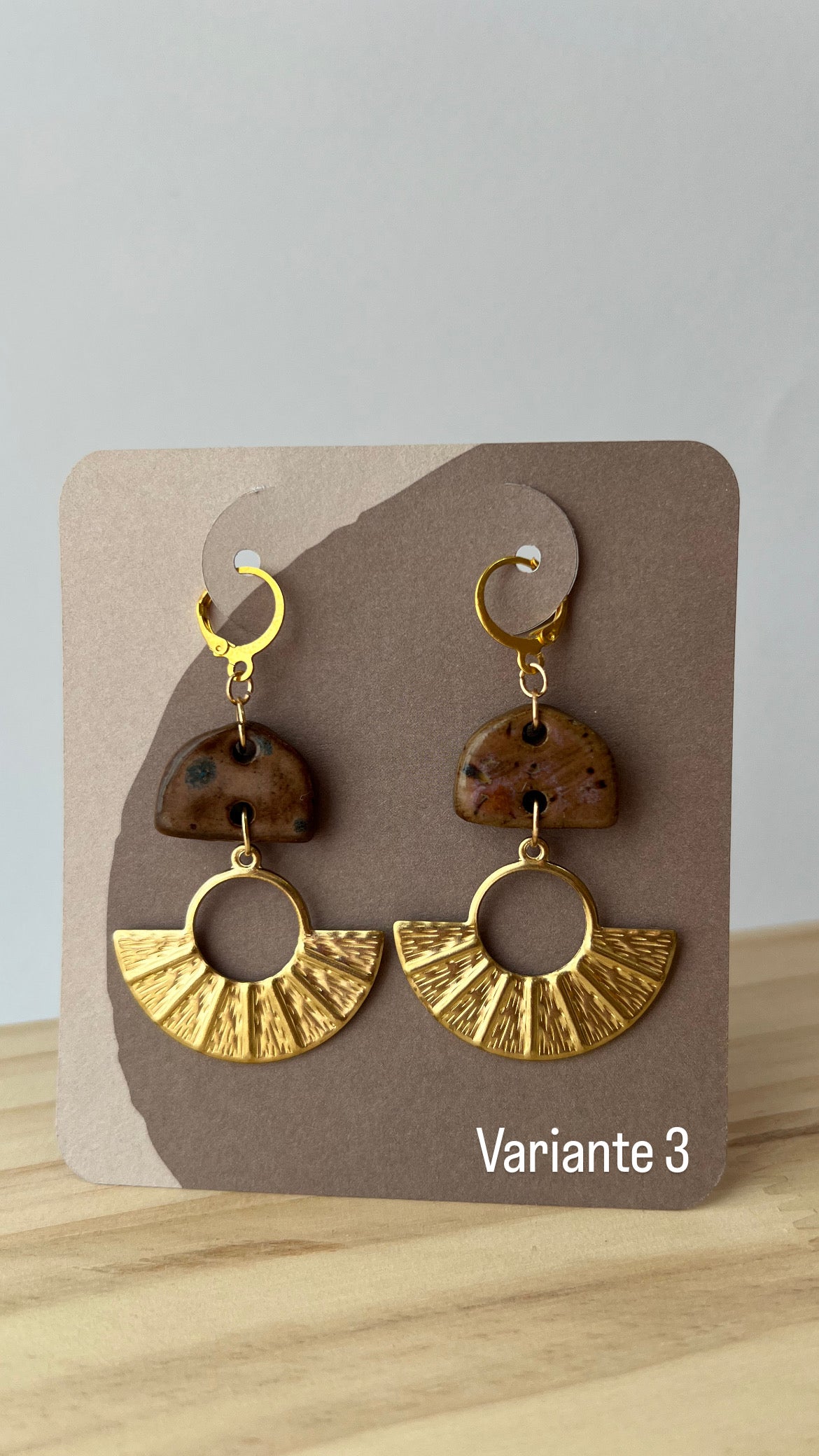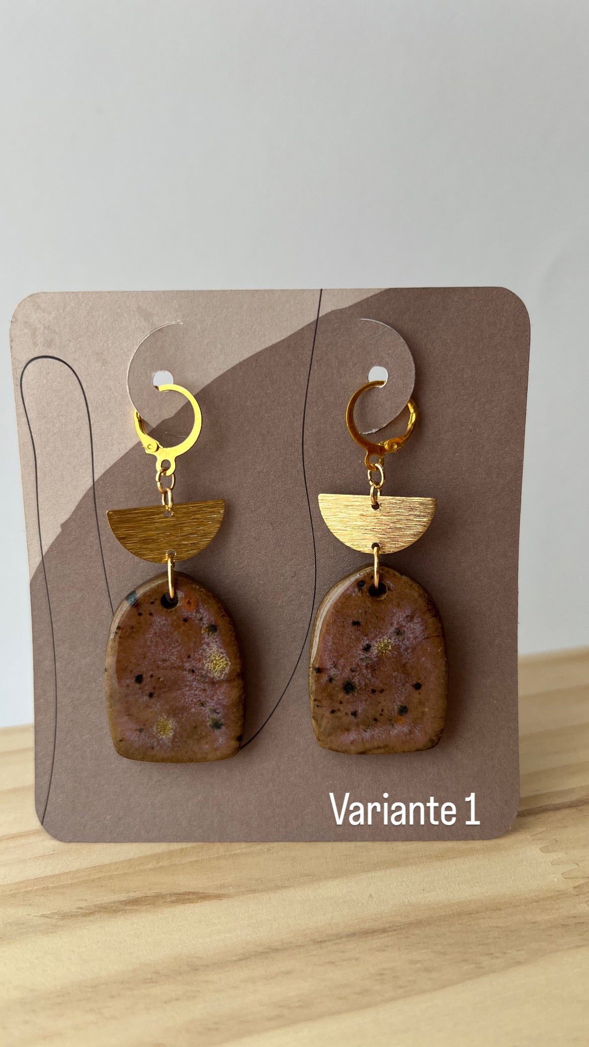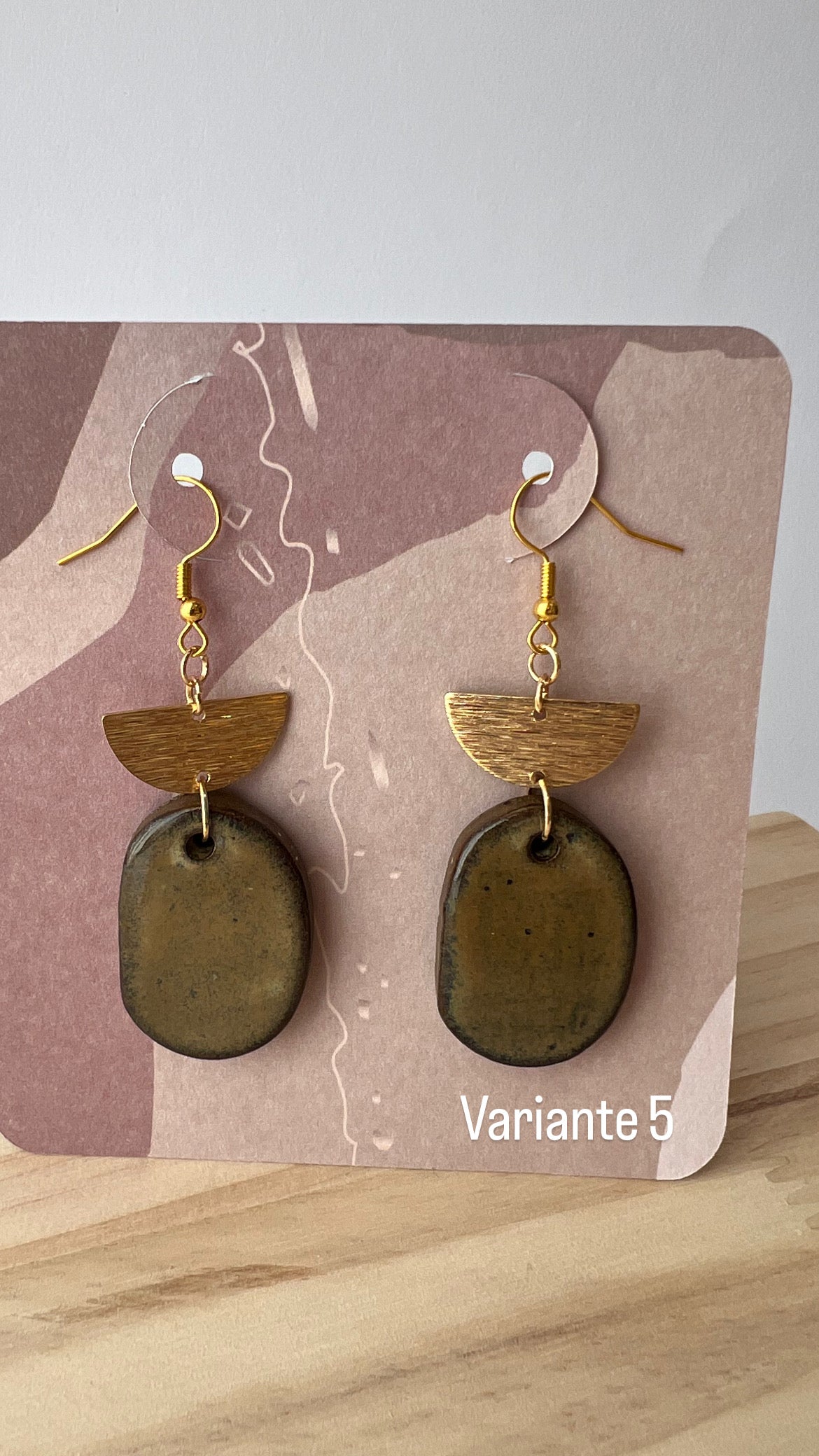 die Kombination aus glasiertem Steinzeug und goldfarbenem Metall macht die Ohrringe zu einem besonderen Hingucker – edel, aber trotzdem unaufgeregt. sie passen perfekt zu Jeans und T-shirt, bringen aber auch zu besonderen Momenten diesen kleinen Glanzmoment ans Ohr.