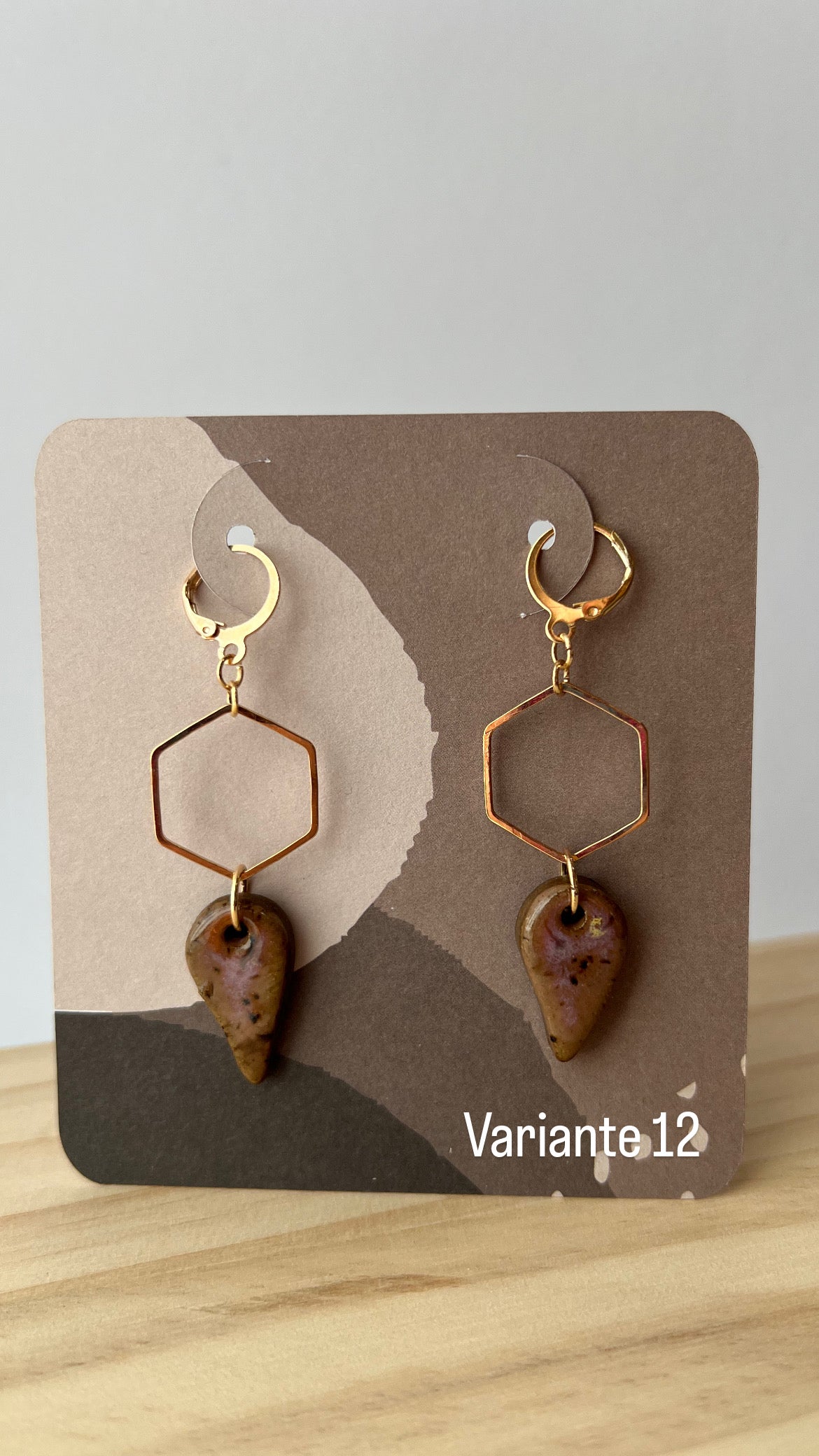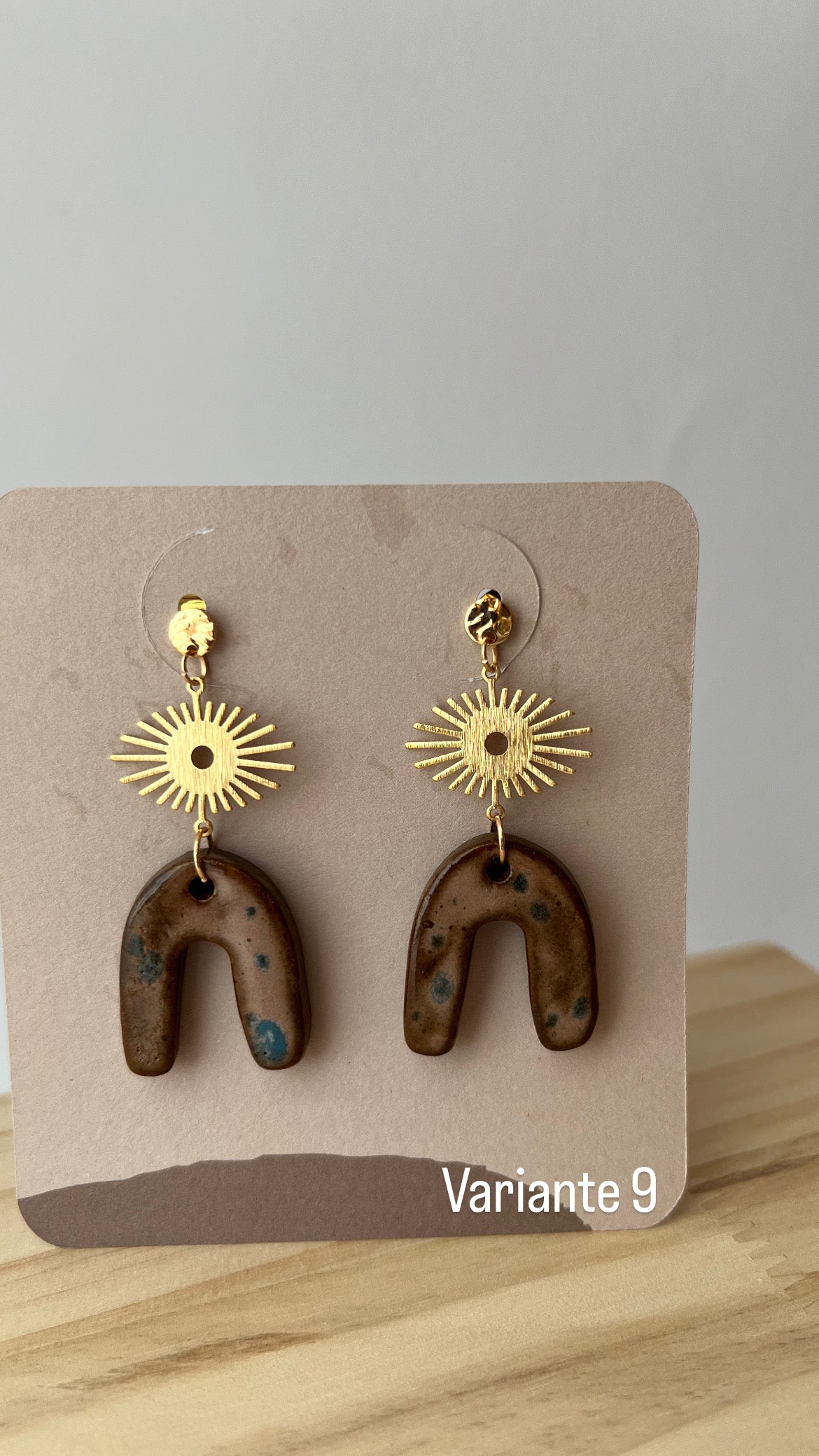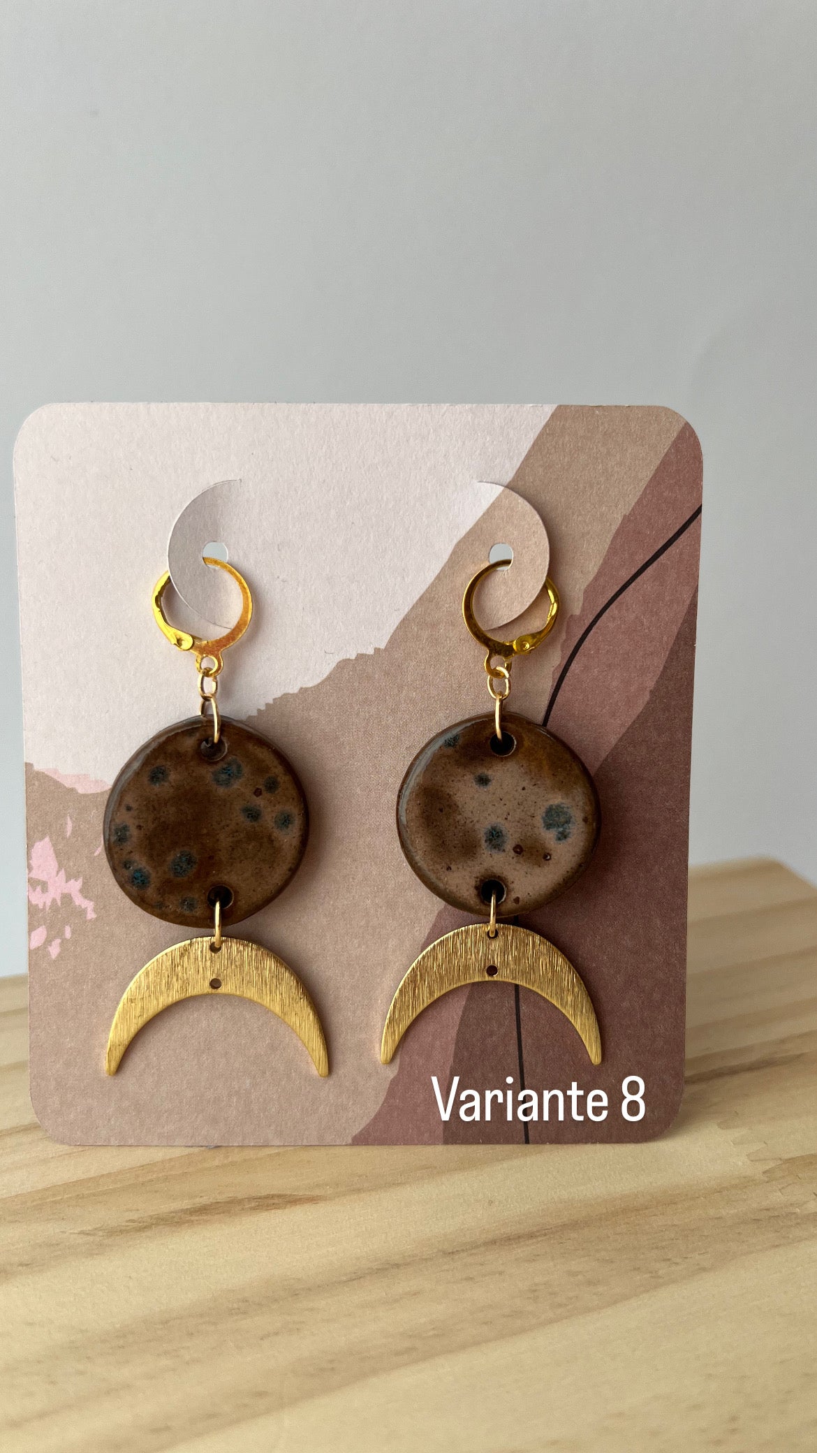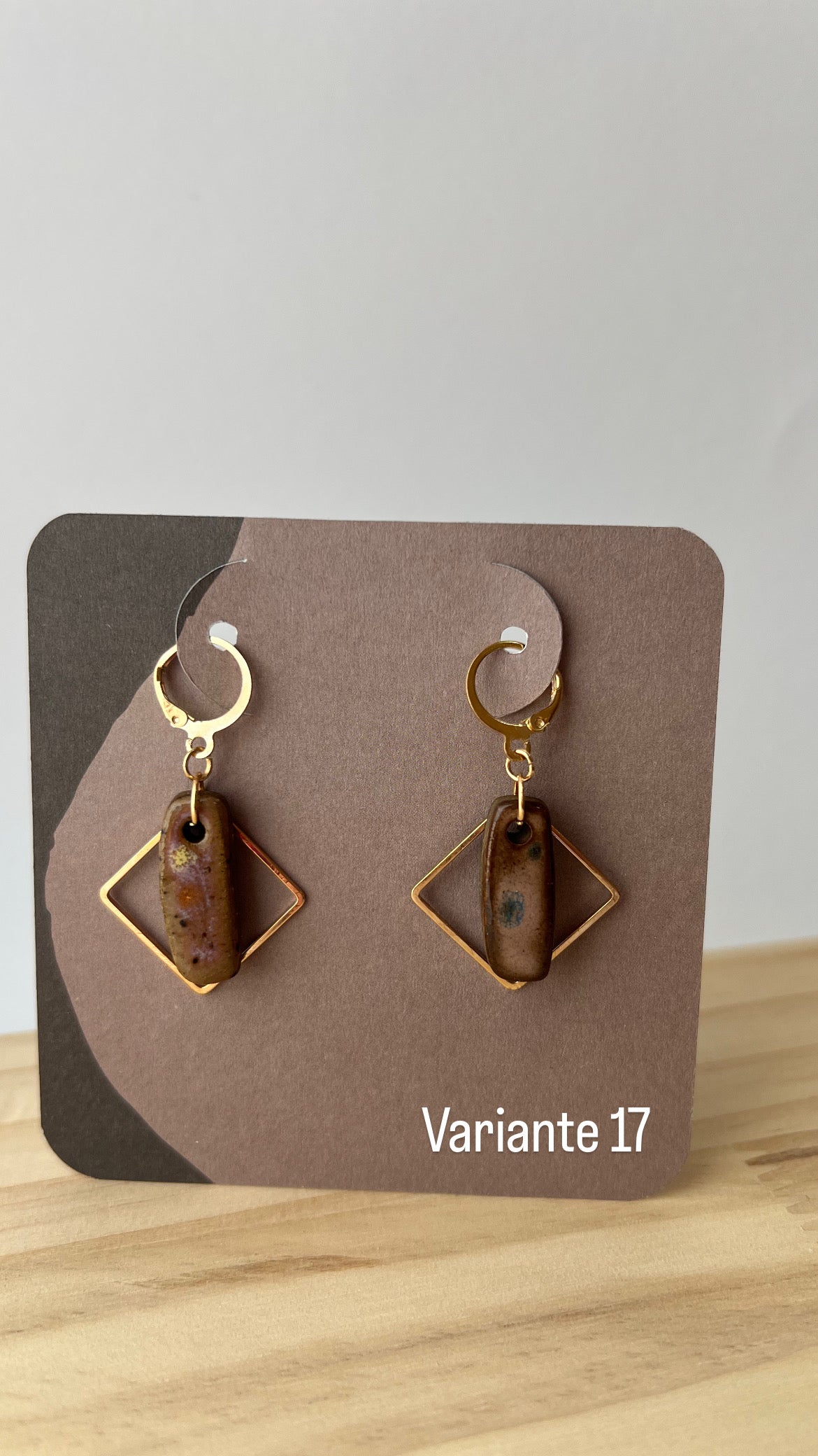 die Kombination aus glasiertem Steinzeug und goldfarbenem Metall macht die Ohrringe zu einem besonderen Hingucker – edel, aber trotzdem unaufgeregt. sie passen perfekt zu Jeans und T-shirt, bringen aber auch zu besonderen Momenten diesen kleinen Glanzmoment ans Ohr.