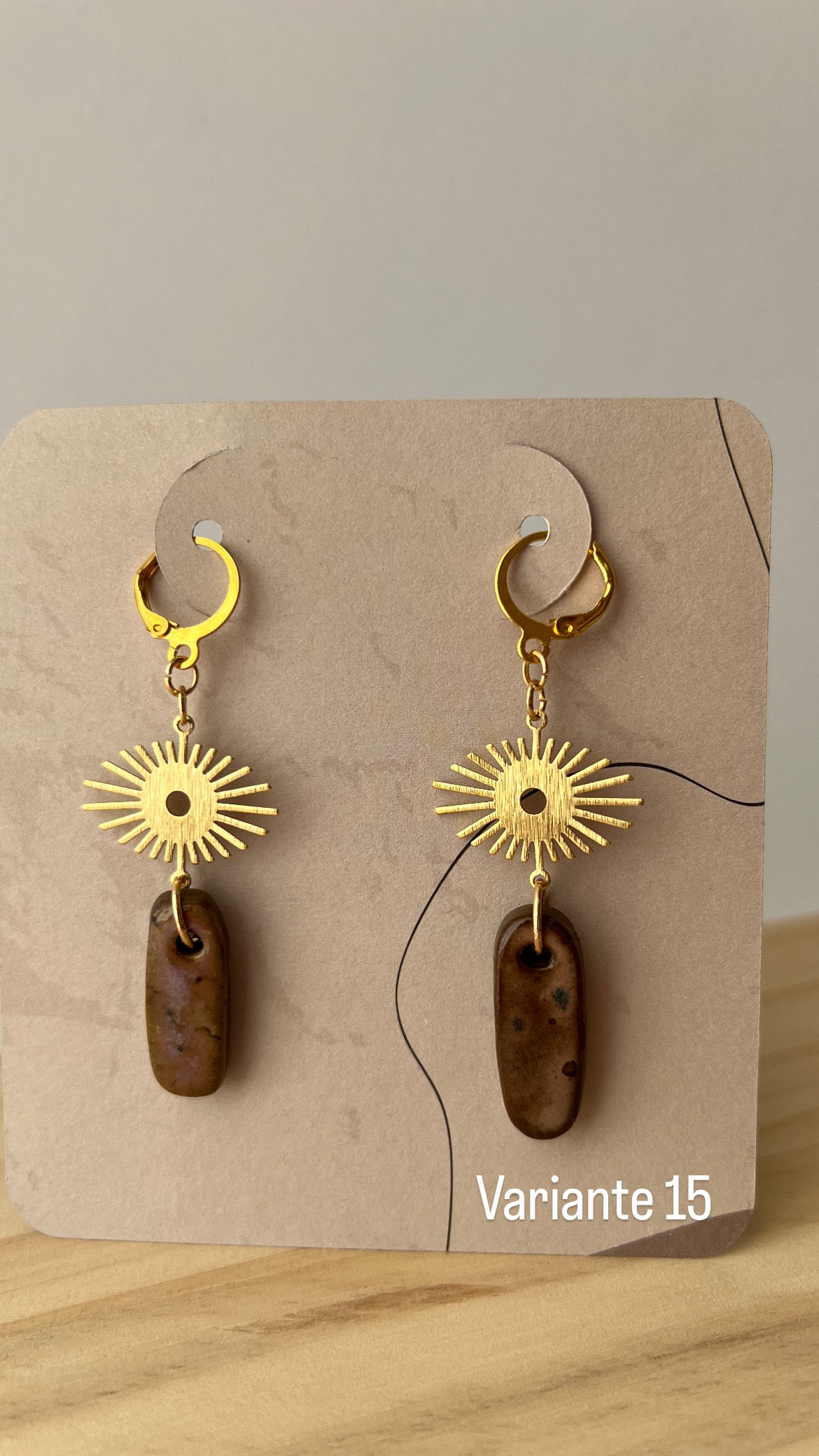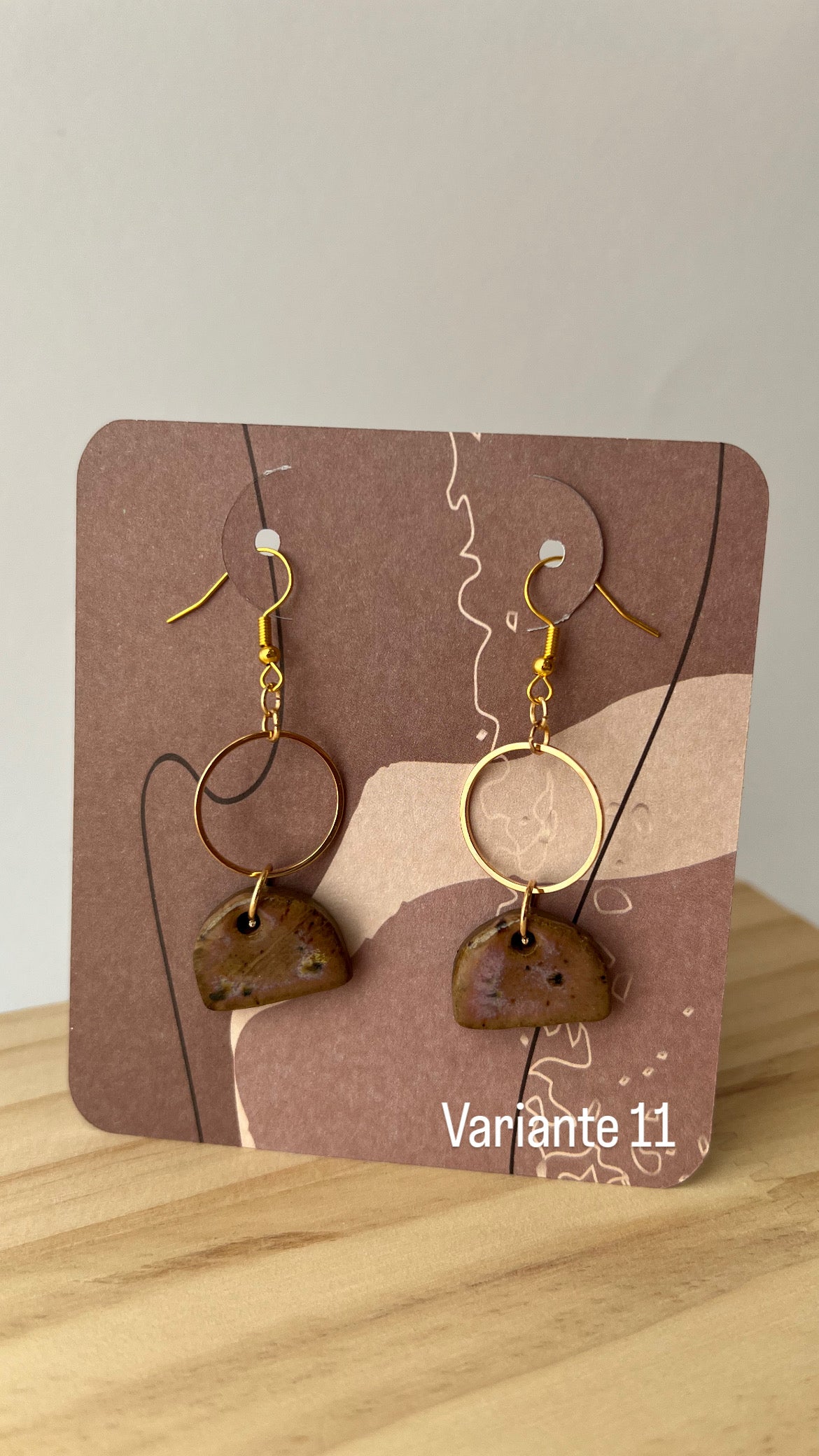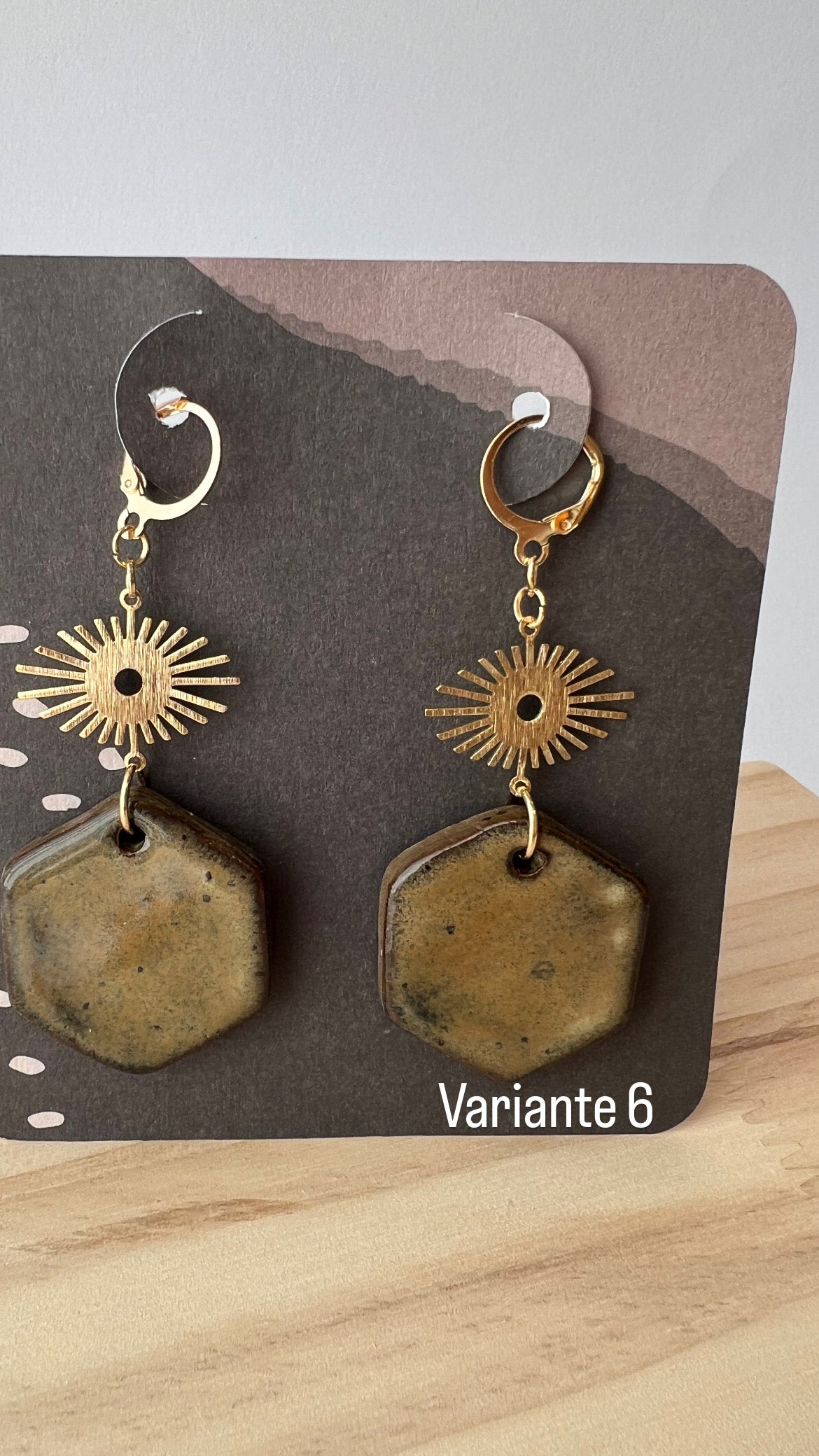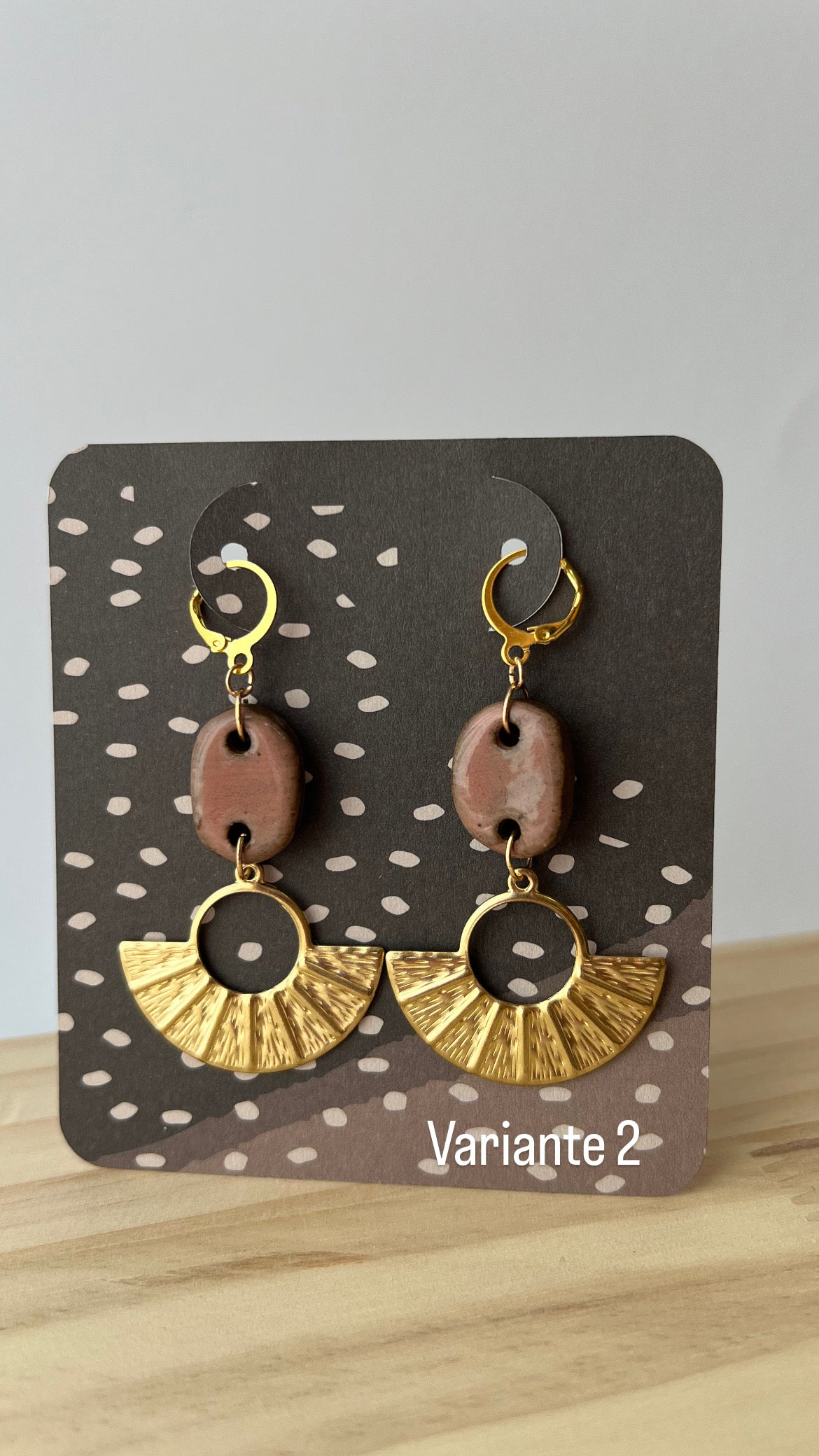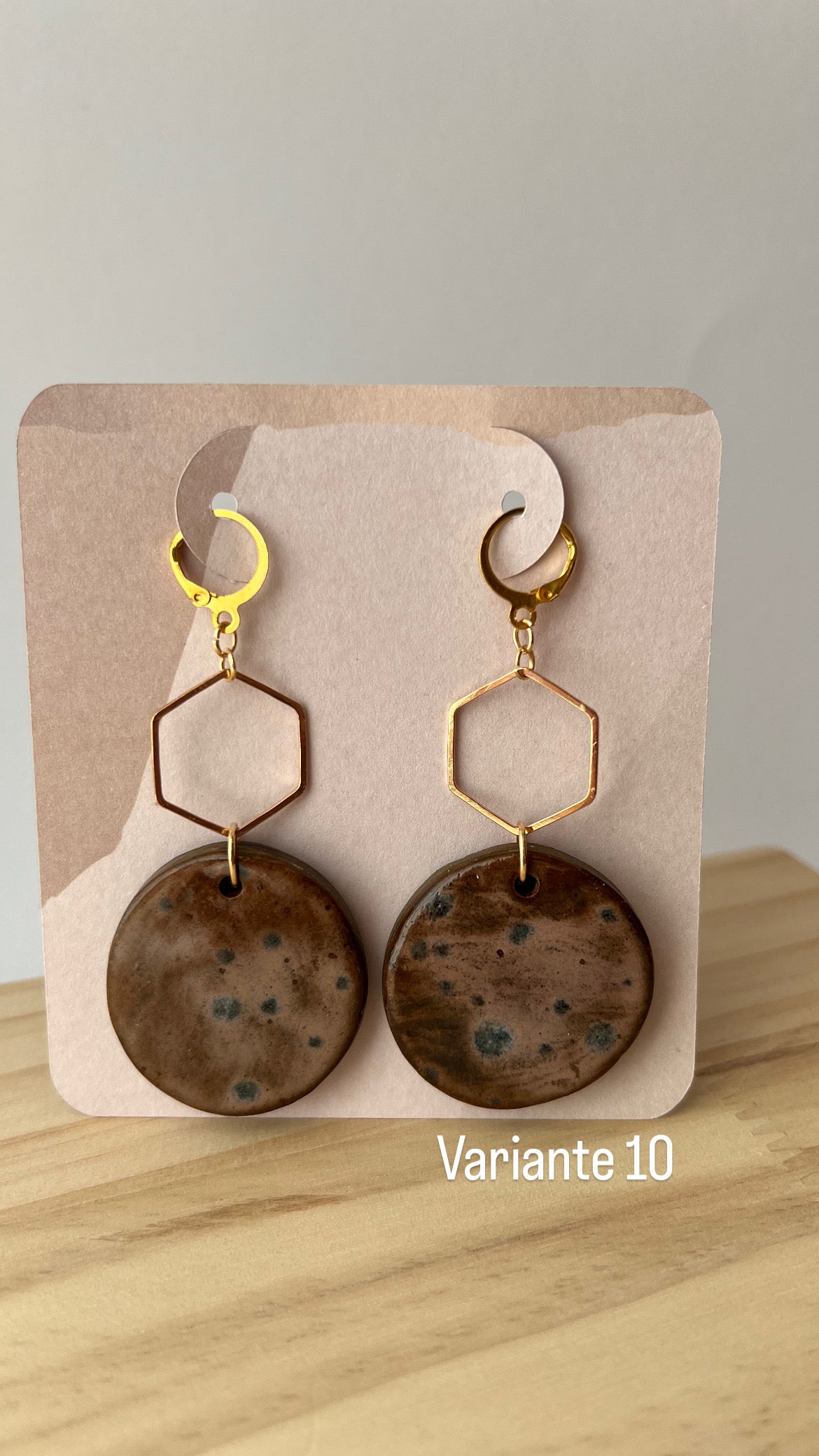die Kombination aus glasiertem Steinzeug und goldfarbenem Metall macht die Ohrringe zu einem besonderen Hingucker – edel, aber trotzdem unaufgeregt. sie passen perfekt zu Jeans und T-shirt, bringen aber auch zu besonderen Momenten diesen kleinen Glanzmoment ans Ohr.